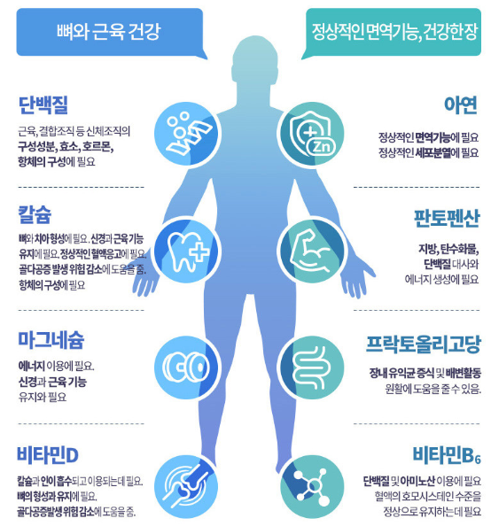 3대 영양소 중 하나인 단백질은 근육 생성에 연관이 있습니다. 꾸준하게 섭취하면 근육 감소를 억제할 수 있습니다.